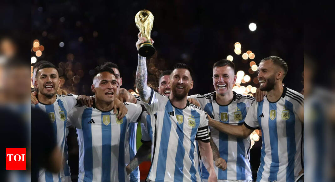 अर्जेटिनाचा लिओनेल मेस्सी आणि टीममेट्स फिफा वर्ल्ड कप ट्रॉफीसह वर्ल्ड चॅम्पियन्सच्या उत्सवाच्या वेळी साजरा करतात. अर्जेंटिनाच्या सॅन्टियागो डेल एस्टेरो येथे 28 मार्च 2023 रोजी एस्टॅडिओ युनिको मॅड्रे डी सिउदादेडे येथे अर्जेंटिना आणि कुरॅसो दरम्यान आंतरराष्ट्रीय मैत्रीपूर्ण सामन्यानंतर. (डॅनियल जयो/गेटी प्रतिमा फोटो)
