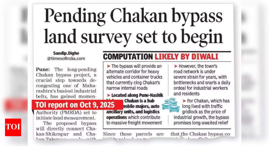 पुणे: कडाचीवाडी-चाकण-शिक्रापूर रस्ता मेदनकरवाडी-पुणे-नाशिक महामार्गाला जोडण्यासाठी तयार करण्यात आलेल्या प्रस्तावित 2.5 किमी चाकण बायपास रस्त्याच्या जमिनीच्या मोजमाप प्रक्रियेला गुरुवारी सुरुवात झाली. चाकण औद्योगिक पट्ट्यातील मोठ्या प्रमाणात होणारी वाहतूक कोंडी कमी करण्याचा या प्रकल्पाचा उद्देश आहे.36 मीटर रुंदीचा हा बायपास खेड तालुक्यातील कडाचीवाडी आणि मेदनकरवाडी गावातून जाणे अपेक्षित आहे. पुणे महानगर प्रदेश विकास प्राधिकरण (PMRDA) या प्रकल्पावर देखरेख करेल, असे अधिकाऱ्यांनी सांगितले. गेल्या आठवड्यात मार्गावरील तीव्र गर्दीवर प्रकाश टाकणाऱ्या मोठ्या निषेध मोर्चानंतर हे पाऊल उचलले गेले.अधिका-यांनी सांगितले की, दोन्ही गावांमधील अंदाजे 21 एकर जमीन संपादित केली जाईल. सध्याच्या जमिनीच्या मोजमापाने संपादनाच्या दिशेने पहिले पाऊल म्हणून चिन्हांकित केले, त्यानंतर जमीन मालकांना नोटीस प्राप्त होतील. बाधित शेतकऱ्यांशी सल्लामसलत करून नंतर नुकसान भरपाईचे दर निश्चित केले जातील. “स्थानिक निवडणुकांपूर्वी आदर्श आचारसंहिता लागू होण्यापूर्वी कामे आणि निविदा जाहीर केल्या जातील,” असे अधिकाऱ्यांनी सांगितले.तथापि, सर्वेक्षणाला काही मेदनकरवाडी शेतकऱ्यांचा सौम्य विरोध झाला, ज्यांनी असा युक्तिवाद केला की प्रस्तावित संरेखन त्यांच्या जमिनीचे विभाजन करेल. त्या ऐवजी लगतच्या ओढ्याने रस्ता पुनर्संचयित करण्याची विनंती केली. मोजमाप पूर्ण केल्यानंतर अंतिम मार्ग निश्चित केला जाईल, असे अधिकाऱ्यांनी सांगितले.पीएमआरडीएचे आयुक्त योगेश म्हसे यांनी योग्य नुकसान भरपाईचे आश्वासन देत सहकार्याचे आवाहन केले. “चाकणमधील वाहतूक कोंडी कमी करण्यासाठी बायपास आवश्यक आहे. शेतकऱ्यांना योग्य आणि वेळेवर नुकसान भरपाई दिली जाईल,” असे ते म्हणाले.मेदनकरवाडीतील शेतकऱ्यांनी या प्रकल्पाला विरोध दर्शवला नाही, तर पारदर्शकतेचे आवाहन केले. ते म्हणाले, “काम सुरळीतपणे चालावे अशी आमची इच्छा आहे, परंतु जमिनी योग्य ठिकाणाहून घेतल्या पाहिजेत जेणेकरून शेतकऱ्यांवर विपरीत परिणाम होणार नाही,” ते म्हणाले.एकदा पूर्ण झाल्यावर, बायपास चाकण-शिक्रापूर आणि पुणे-नाशिक महामार्गांना थेट जोडेल, ज्यामुळे परिसरातील औद्योगिक वाहतुकीला मोठा दिलासा मिळेल.