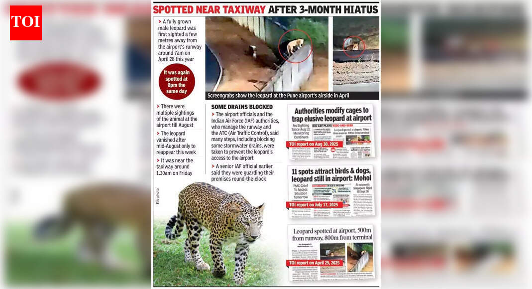 पुणे : मोठी मांजर परत आली आहे. तीन महिन्यांच्या विश्रांतीनंतर ते पुन्हा विमानतळावर पोहोचले आहे.ट्रॅप कॅमेरे पुन्हा कार्यरत झाले आहेत. तसेच पिंजरे असतील… महागड्या कॅचसाठी.या आठवड्यात विमानतळाच्या टॅक्सीवेजवळ पुन्हा बिबट्या दिसल्याची खात्री वनविभागाच्या अधिकाऱ्यांनी शनिवारी केली. एका सूत्राने सांगितले की, शनिवारी पहाटे हा प्राणी आवारात दिसला. शुक्रवारी पहाटे दीडच्या सुमारास ते टॅक्सीवेजवळ होते. या आठवड्याच्या सुरुवातीला विमानतळावर हा प्राणी पुन्हा एकदा दिसला.कोणत्याही उड्डाण हालचालीवर परिणाम झाला नाही. काही महिन्यांपूर्वी हाच बिबट्या विमानतळावर असल्याची माहिती काही वन अधिकाऱ्यांनी दिली होती.पुणे परिमंडळाचे मुख्य वनसंरक्षक आशिष ठाकरे म्हणाले, विमानतळावर चार ट्रॅप कॅमेरे बसविण्यात आले आहेत. आम्ही ट्रॅप पिंजरे देखील बसवू. हा बिबट्या एअरफोर्स स्टेशनच्या अंतर्गत असलेल्या जटिल बोगद्याचा फायदा घेत आहे.”नागरी विमान वाहतूक राज्यमंत्री मुरलीधर मोहोळ यांनी वनविभागाच्या अधिकाऱ्यांना बिबट्याला पकडण्यासाठी विमानतळ आणि भारतीय हवाई दल (IAF) अधिकाऱ्यांच्या समन्वयाने जलद गतीने काम करण्यास सांगितले. रविवारी ते त्यांच्यासोबत बैठकीचे अध्यक्षस्थान भूषवण्याची शक्यता आहे. मंत्र्यांच्या जवळच्या सूत्राने सांगितले की, “रनवे आणि टॅक्सीवेजवळील लाईट वाढवण्याच्या सूचना देण्यात आल्या आहेत.”मंगेश ताटे, सहाय्यक वनसंरक्षक यांनी TOI ला सांगितले की, त्यांना काही दिवसांपूर्वी विमानतळ प्राधिकरणाकडून प्राणी पाहण्याबाबत संदेश मिळाला होता. ते म्हणाले, “एअरसाइडच्या काही उघड्यांमधून ते विमानतळावर प्रवेश केले असावे. त्यांनी (विमानतळ अधिकाऱ्यांनी) प्राण्याचे कोणतेही छायाचित्र शेअर केले नाही,” तो म्हणाला.एअरसाइड हा विमानतळाचा सुरक्षा चौक्यांच्या पलीकडे असलेला विभाग आहे.यापूर्वी, 28 एप्रिल रोजी विमानतळावर दोनदा बिबट्या दिसला होता – प्रथम सकाळी 7 च्या सुमारास आणि नंतर रात्री 8 च्या सुमारास. त्यानंतर, ऑगस्टच्या मध्यापर्यंत ते सुविधेत अनेक वेळा पाहिले गेले. भारतीय विमानतळ प्राधिकरण (AAI), IAF आणि वनविभागाने संयुक्तपणे बिबट्याला पकडण्यासाठी अनेक पावले उचलली, पण ती निष्फळ ठरली.मोहोळ यांनी 16 जुलै रोजी बिबट्या विमानतळावर ये-जा करत असल्याचे सांगितले होते. ज्या वादळाच्या पाण्याच्या नाल्यांमधून प्राणी सुविधेत शिरले ते ओळखून ते अडवा, असे वनविभागाला सांगण्यात आले. उपाययोजना केल्यानंतर ऑगस्टच्या मध्यानंतर या आठवड्यापर्यंत बिबट्या दिसला नव्हता.सहाय्यक वनसंरक्षक टेटे म्हणाले, “बिबट्या हे लाजाळू प्राणी आहेत. ते एखाद्या प्रदेशात फिरतात. विमानतळ परिसर हा या बिबट्याच्या 