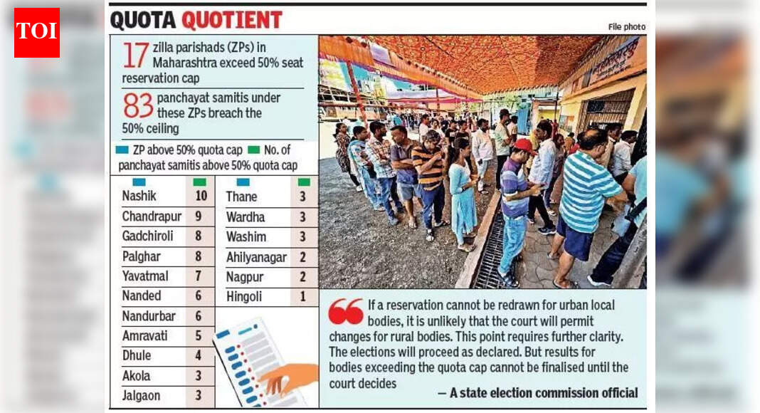 पुणे: राज्य निवडणूक आयोग (SEC) दीर्घकाळ प्रलंबित असलेल्या जिल्हा परिषद आणि पंचायत समित्यांच्या निवडणुका टप्प्याटप्प्याने आयोजित करू शकते, ज्यात ५०% आरक्षण मर्यादेत असलेल्या स्थानिक स्वराज्य संस्थांचे उल्लंघन केले आहे. 32 जिल्हा परिषदा (ZPs) आणि 336 पंचायत समित्यांच्या निवडणुका होणार आहेत. यापैकी, एकूण 17 झेडपी आणि 83 पंचायत समित्यांनी आरक्षण मर्यादा ओलांडली आहे, SEC च्या मूल्यांकनानुसार.एका SEC अधिकाऱ्याने सांगितले की सर्वोच्च न्यायालयाच्या (SC) आदेशाने स्पष्ट केले आहे की अनुपालन संस्थांच्या निवडणुका “मागील आदेशांनुसार” पुढे जाणे आवश्यक आहे, ज्यामुळे ZPs आणि पंचायत समित्यांमध्ये तात्काळ निवडणुका सक्षम होतील ज्यांनी कोटा कमाल मर्यादा भंग केली नाही. उर्वरित भागातील निवडणुकीसाठी पुढील निर्देशापर्यंत प्रतीक्षा करावी लागेल.अधिकाऱ्याने सांगितले की, “निवडणुका टप्प्याटप्प्याने घ्याव्यात की नाही यावर चर्चा केली जात आहे कारण 50% आरक्षण मर्यादेचे उल्लंघन करणाऱ्या ZP आणि पंचायत समित्यांसाठी अद्याप कोणतीही स्पष्टता नाही.” SC ने शुक्रवारी सांगितले की, कॅप ओलांडणाऱ्या शहरी संस्थांचे निकाल कार्यवाहीच्या निकालांच्या अधीन राहतील, परंतु आधीच मर्यादेपेक्षा जास्त असलेल्या ZP आणि पंचायत समित्या कशा हाताळल्या पाहिजेत हे स्पष्ट केले नाही. न्यायालयाच्या आदेशात म्हटले आहे की, “32 झेडपी आणि 336 पंचायत समित्यांच्या संदर्भात, असे निर्देश दिले आहेत की जेथे आरक्षण 50% पेक्षा जास्त नसेल तेथे आमच्या पूर्वीच्या आदेशानुसार निवडणुका घेऊ द्या.“SC ने उंबरठा ओलांडलेल्या स्थानिक स्वराज्य संस्थांसाठी आरक्षणाचे कोणतेही पुनर्चित्रण करण्यास परवानगी दिलेली नाही. SEC अधिकाऱ्यांनी सांगितले की हे शहरी आणि ग्रामीण संस्थांना समान रीतीने लागू होते आणि न्यायालयाचा नियम होईपर्यंत आयोग आरक्षण संरचनांमध्ये बदल करू शकत नाही. “जर शहरी स्थानिक स्वराज्य संस्थांसाठी आरक्षण पुन्हा काढता येत नसेल, तर न्यायालय ग्रामीण संस्थांसाठी बदल करण्यास परवानगी देईल अशी शक्यता नाही. या मुद्यावर आणखी स्पष्टता आवश्यक आहे,” असे एसईसीच्या आणखी एका अधिकाऱ्याने सांगितले.नागरी प्रवर्गात केवळ नागपूर आणि चंद्रपूर महानगरपालिकेने मर्यादा ओलांडली आहे. अधिकाऱ्यांनी सांगितले की सर्व कॉर्पोरेशन्सच्या निवडणुका आता “विलंब न लावता” अधिसूचित केल्या पाहिजेत, या समजुतीने की मर्यादा ओलांडणाऱ्या दोन महामंडळांचे निकाल एससीच्या अंतिम निर्णयावर अवलंबून असतील.सध्या सुरू असलेल्या नगरपरिषद आणि नगर पंचायत निवडणुकांनाही अशीच चौकट लागू आहे. 50% पेक्षा जास्त आरक्षण असलेल्या 40 नगरपरिषदा आणि 17 नगर पंचायतींचे निकाल न्यायालयीन निकालाच्या 