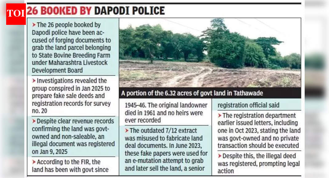 पुणे: ताथवडे येथील 6.32 हेक्टर सरकारी जमिनीचे विक्रीपत्र रद्द करण्यासाठी राज्याचे पशुसंवर्धन विभाग पुणे न्यायालयात दिवाणी दावा दाखल करणार आहे, जी उपनिबंधकांनी राज्याच्या अनिवार्य मंजुरीशिवाय खाजगी पक्षाकडे बेकायदेशीरपणे हस्तांतरित केली होती. वरिष्ठ अधिकाऱ्यांनी पुष्टी केली की खाजगी पक्षाने परस्पर रद्दीकरण डीड अंमलात आणण्यास नकार दिल्यानंतर, दिवाणी खटला हा एकमेव कायदेशीर उपाय म्हणून विभागाने गेल्या आठवड्यात न्यायालयात संपर्क साधला.पशुसंवर्धन आयुक्त प्रवीण देवरे यांनी TOI ला सांगितले की विभागाने परस्पर निराकरणासाठी सर्व पर्याय संपवले आहेत. “दुसरा पक्ष तयार नसल्यामुळे, आम्ही दिवाणी खटला चालवत आहोत, जो पुढील आठवड्यात दाखल केला जाईल आणि न्यायालयाच्या अंतिम आदेशाची अंमलबजावणी करावी लागेल,” ते म्हणाले. देवरे पुढे म्हणाले की, न्यायालय या प्रकरणाचा निकाल देत नाही तोपर्यंत पुढील व्यवहार किंवा विक्रीचे प्रयत्न टाळण्यासाठी सरकारी नोंदींमध्ये जमीन “वादग्रस्त” म्हणून चिन्हांकित केली जाईल.दिवाणी खटल्याबरोबरच, विभागाने महसूल अधिकाऱ्यांना नोंदणी विभागाने फॉरवर्ड केलेली फेरफार नोंद रद्द करण्यास सांगितले आहे. तिची यथास्थिती आता पुनर्संचयित केली गेली आहे आणि उत्परिवर्तन नोंदी जमिनीच्या पार्सलचे योग्य मालक म्हणून सरकार दर्शवतात.कायदेशीर कारवाईवर देखरेख ठेवणारे अतिरिक्त आयुक्त शितलकुमार मुकणे म्हणाले, दिवाणी खटल्याची कागदपत्रे पूर्ण झाली आहेत. “सरकारी जमीन हडप करण्यासाठी बनावट कागदपत्रे वापरण्यात आल्यानंतर मंडळ अधिकाऱ्याने आधीच योग्य फेरफार नोंद असल्याची खात्री केली आहे,” त्याने TOI ला सांगितले.अवैध नोंदणीची प्रक्रिया करणाऱ्या उपनिबंधकांवर महसूल विभागाने यापूर्वी कारवाई सुरू केली होती. सुधारित फेब्रुवारी 2025 आवृत्तीऐवजी जुने जून 2023 7/12 उतारा स्वीकारल्याबद्दल त्याला निलंबित करण्यात आले, ज्यात स्पष्टपणे ‘सरकारी परवानगीशिवाय खरेदी-विक्री करण्यास मनाई’ असे नमूद केले होते. अधिकाऱ्यांना असे आढळून आले की त्याने अनिवार्य तपासण्यांना बायपास करण्यासाठी सिस्टमच्या ‘स्किप’ पर्यायाचा वापर केला. रेकॉर्ड केलेल्या जमीनमालकाचा दशकांपूर्वी मृत्यू झाला होता आणि कोणत्याही वारसांची यादी नव्हती. सुमारे 750 कोटी रुपयांची ही जमीन एका खासगी कराराद्वारे 33 कोटी रुपयांना हस्तांतरित करण्यात आली. नोंदणी महानिरीक्षक (IGR) कार्यालयाने नोंदणीमध्ये “स्पष्ट अनियमितता” असल्याचे ध्वजांकित केले होते आणि महाराष्ट्र नागरी सेवा (शिस्त आणि अपील) नियम, 1979 च्या नियम 4 अंतर्गत सब-रजिस्ट्रारला निलंबित केले होते. त्यांना मुख्य मुद्रांक कार्यालय, मुंबई येथे कळवण्याचे नि